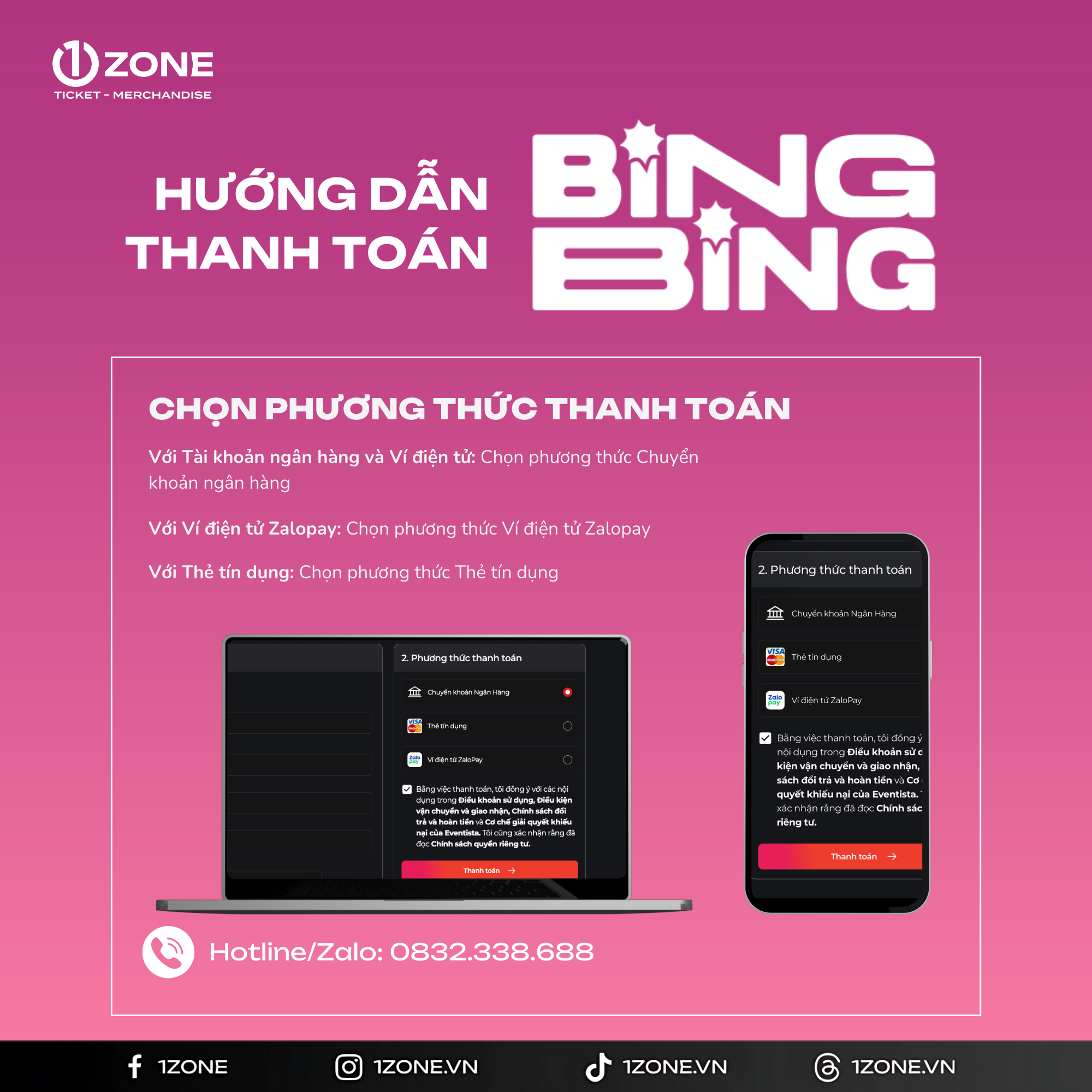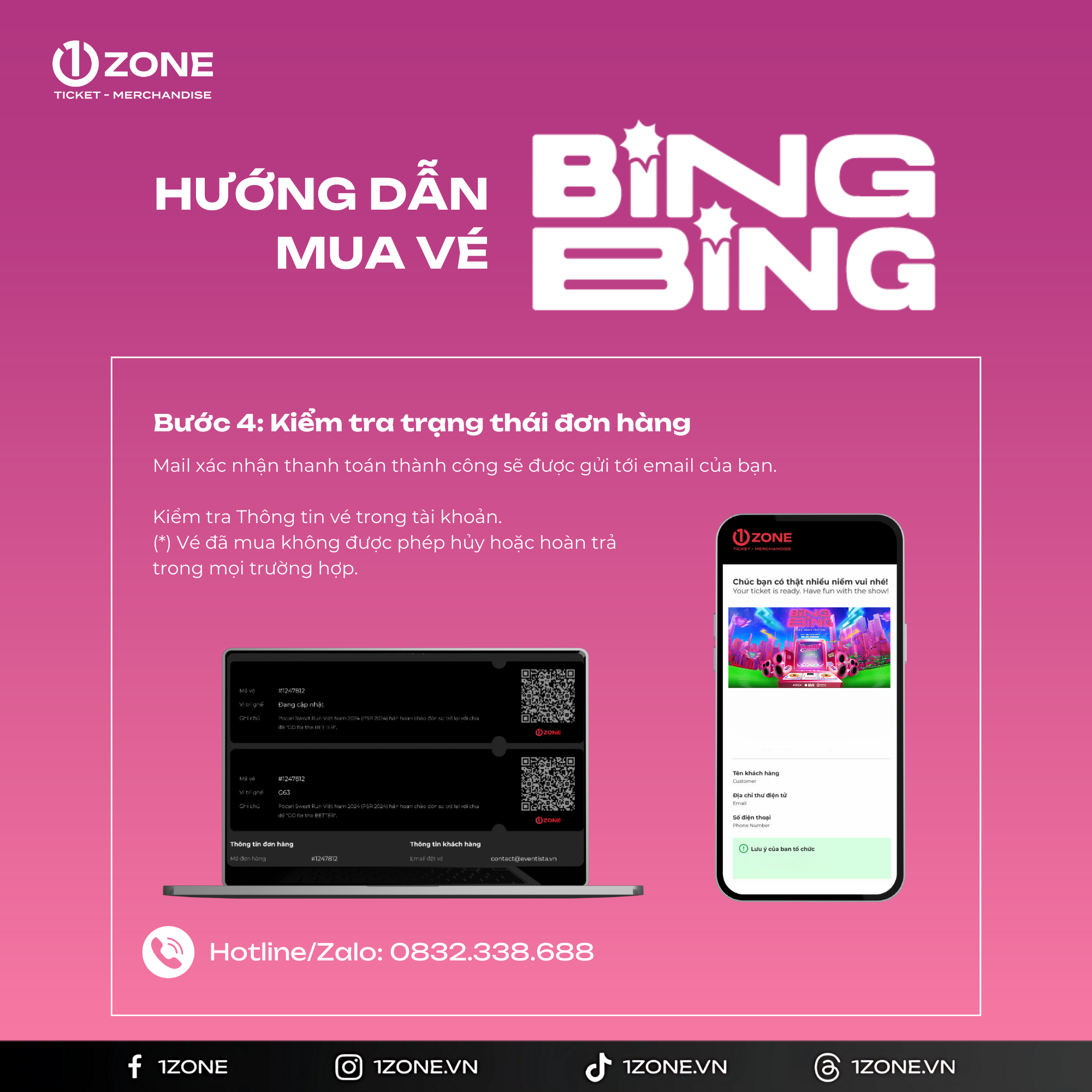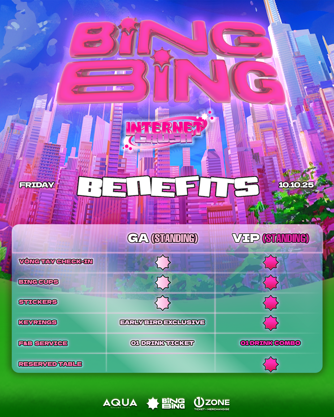 Bao gồm: Vòng tay check-in; BING Cup; Stickers; Keyrings (Early Bird Exclusive); F&B Service (1 drink ticket); Khách được tự do di chuyển trong không gian